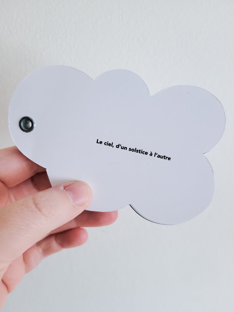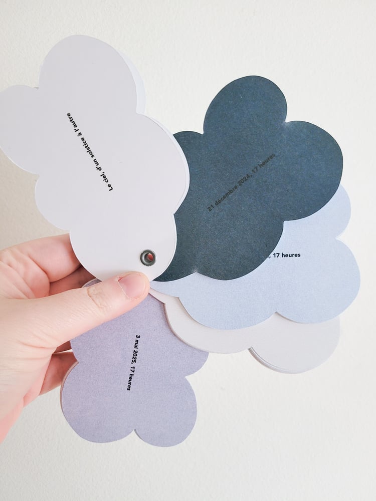 Impression en 4 couleurs, 29 pages, carton Lynx 14 points. Chaque nuage mesure environ 11 cm x 7 cm. Chaque zine est découpé à la main et la forme des nuages varie d'un zine à l'autre.