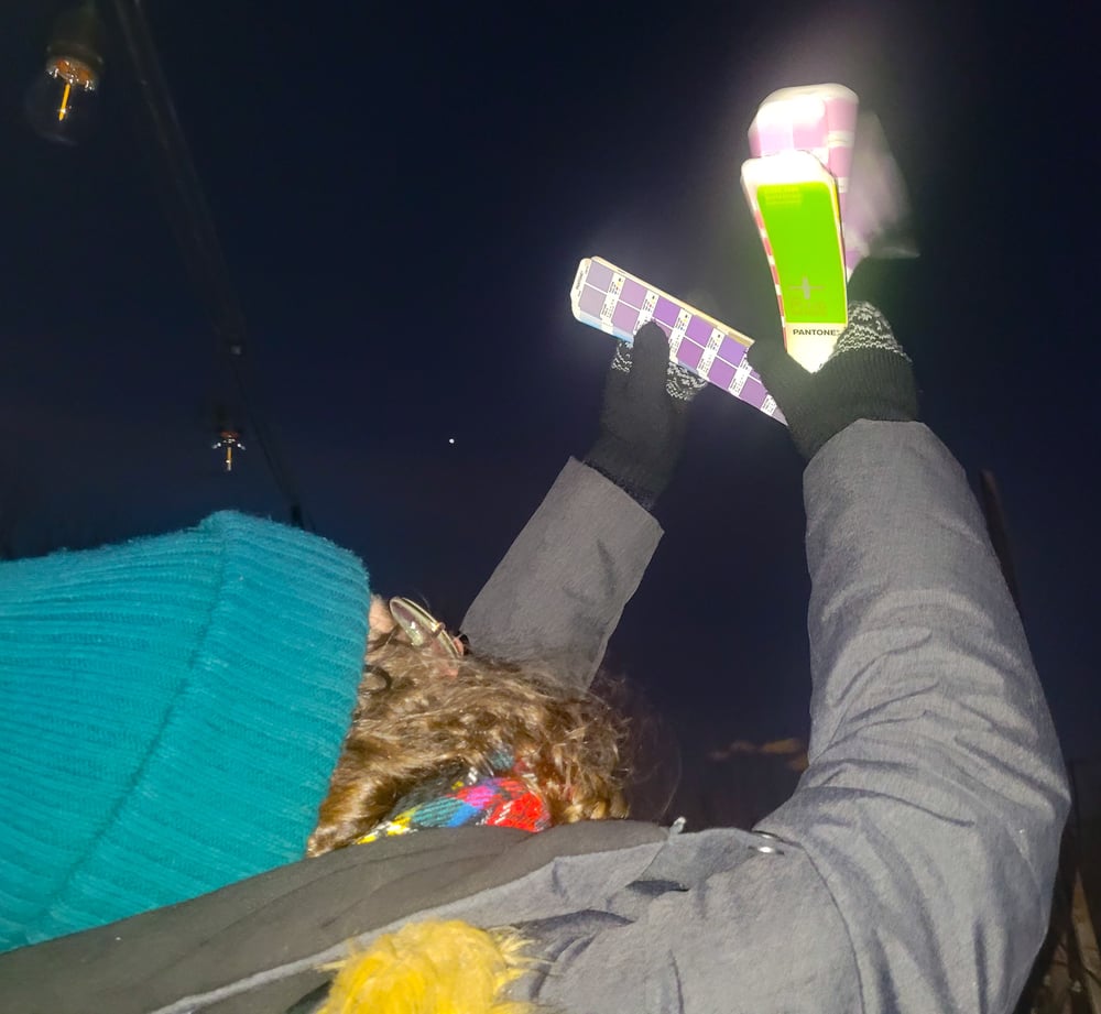 De décembre 2024 à juin 2025, nous avons relevé la couleur du ciel les samedis, à 17 heures. Nous avons reproduit les couleurs en faux-CMYK en riso dans ce zine qui se déploie comme une charte de couleurs.